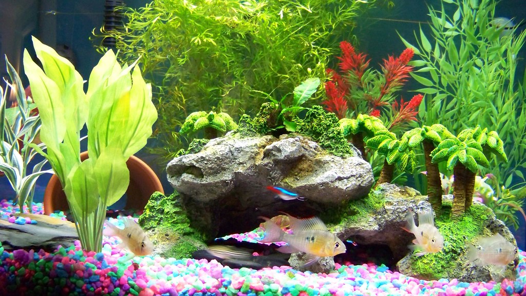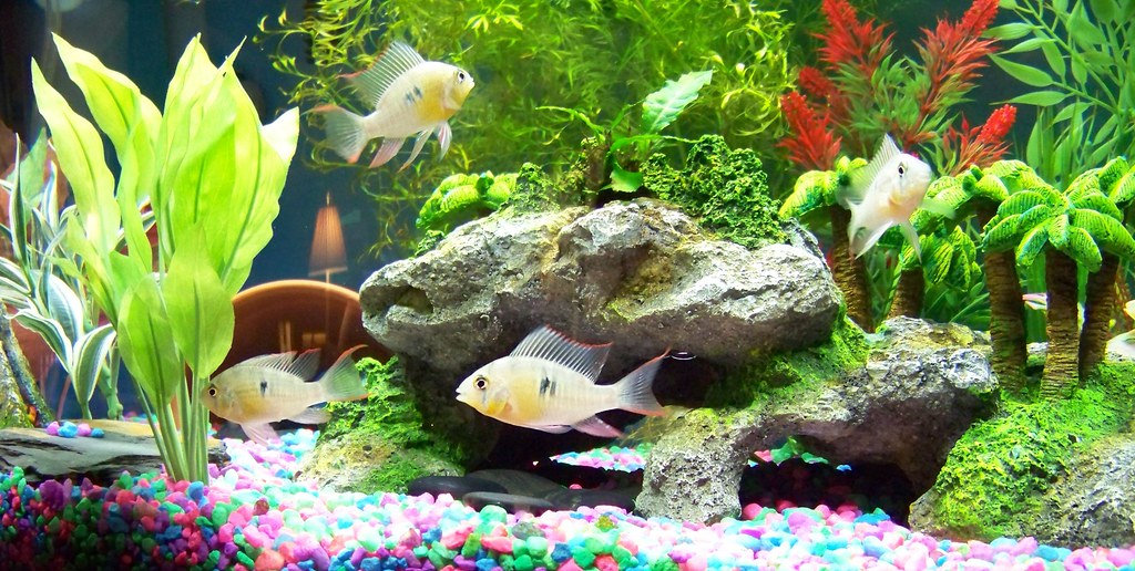 1. First water change and cleaning since getting the Rams. After a 25% water change and good vacuuming of the tank (and cleaning decorations, etc.), the Rams got very active. They roamed the tank as a squad, and sometimes nipped at each other. It is the most activity they have shown since putting them in the tank.