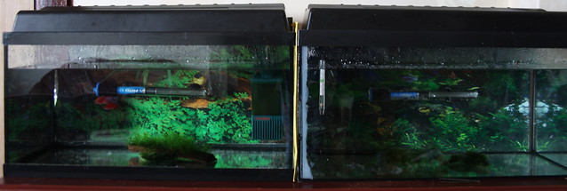 I've been planing on trying to breed betta for some time so I went to pets at home the other day (22/03/13) and seen a male and female I liked the look of. So of course I got them! I think It will be very interesting (if every thing goes well) to see what colors they produce. I have put each in a 52L tank placed next to each other so the fish can see each other but have placed an envelope between them to let them have peace to get used to the new tank. The tanks are a bit bare, I want to put more plants in the female tank but I think I will leave the males as it is for breeding. There is just some java moss in each tank just now and I have ordered some almond leaves which I hear help the bettas health and breeding. There is also a bit of bubble rap for a nest in the corner of the males tank (around 3x4 inch) which he has already started to use. I have put this in so early so he is used to having a nest there. I have also got my microworms and have started an infusoria culture.