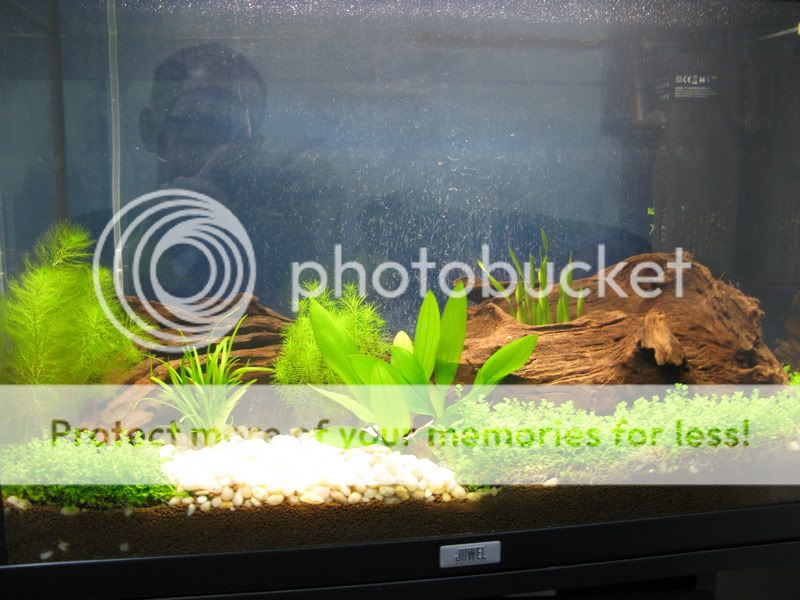 I'm using a 15 watt 'JBL Solar Tropic' flourescent (the highest wattage i could find for my 438mm T8 fittings thats come in the stock tank hood. A basic filter with woolen media and activated carbon. I did have an air pump going but it was creating a hell of a lot of bubbles and current for the size of my tank (not to mention noise) so I'm experimenting by turning it off, the filter creates a bit of surface agitation.