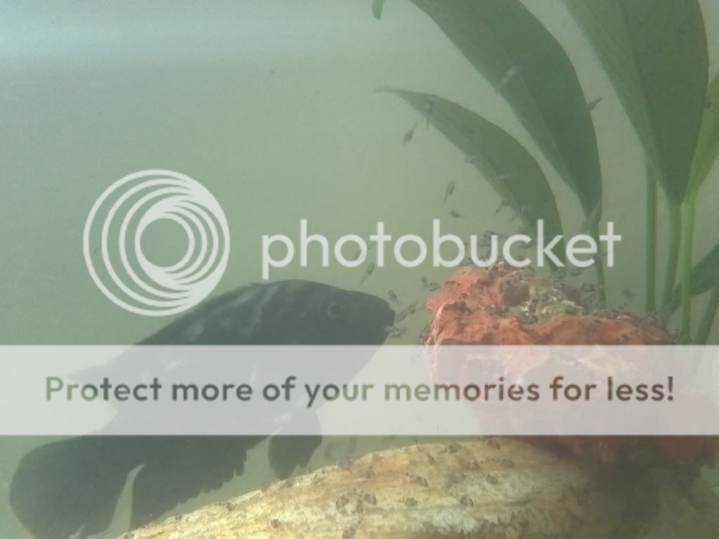 Fry are starting to spread slightly around the rocks of their cave, but staying pretty close. Both Parents are hovering above them at all times and moving them back when they stray more the a few inches...