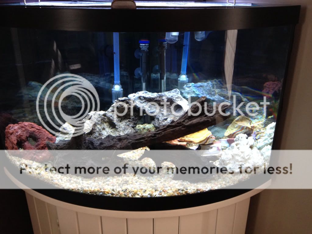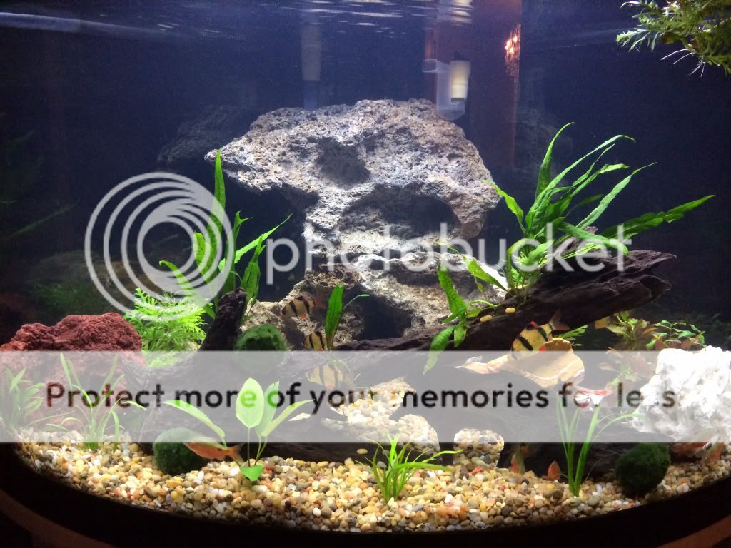 That's a cell phone pic so I apologize for the quality and glare. One thing I didn't take a picture of was the step before when I added my Seachem Flourite gravel. The instructions recommended a rinse to remove any residual dust....which I did. Talk about an understatement!! Anyone who has used the stuff knows what I'm talking about! By the time I filled the tank half way it looked as if I was using mud! I was so disheartened because I had so been looking forward to getting the tank going. Anyhow I removed the gravel, cleaned the tank, re-rinsed the gravel with a bucket and garden hose and finally set-up the tank which is the pic above.