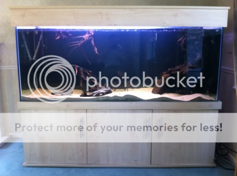 The water is a little bit murky (looks pretty much from front on but if you look through the 6' of water from the side you can see), and I've got a little film on the surface - I think both of these could be attributable to all the bogwood in there and some bacterial bloom. There is some brown algae starting to form on the glass - we'll see if this is temporary.