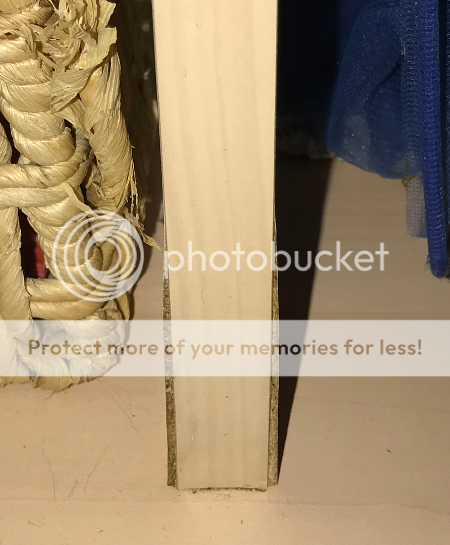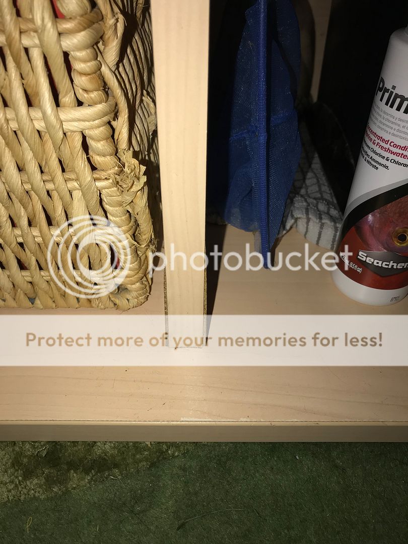 Saturday morning I was tiding up the front room and dusting my tank when I noticed that one of the vertical supports appeared to be losing the outer layer. The tank is about 13 years old and is made by Rena. It's a 120x40x60 and the stand is basically a kind of MDF/chipboard that the tank rests on.