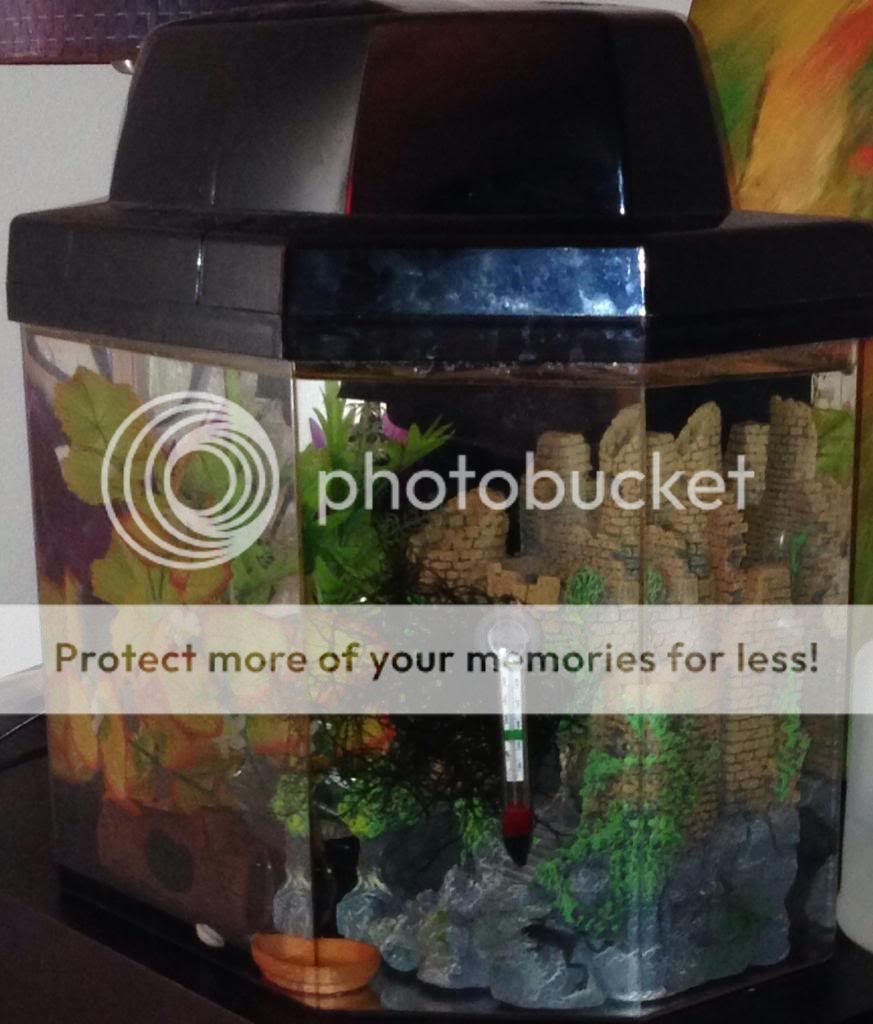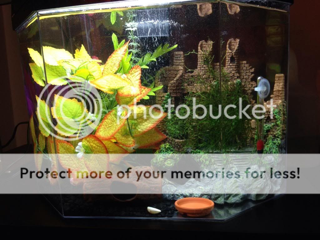 The 5 gal is perfect for my shy ADFs (that are slightly smaller than a quarter/euro) each, but I'm worried their is too much stuff in there for the betta to swim comfortably.