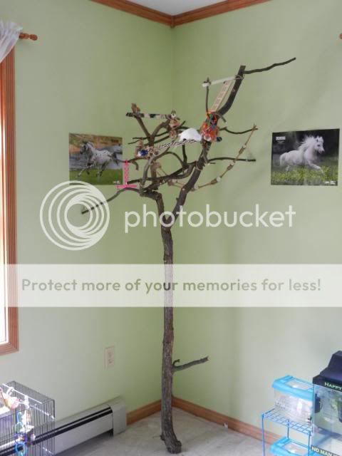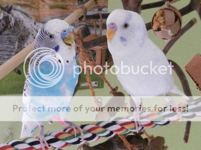 butch (left) and Leon. butch lost his friend in march and i eventually had a dream with a white parakeet with bars on its head.. the next day i was on Craigslist and saw leon, a white keet with bars on his head (and a blue back), and so i got him. butch was from the shelter and probably abused before that because he is very afraid of people. he now comes out with leon on the big tree in my room