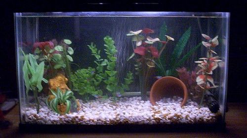 My 10 gallon tank used to have black river rock and a lot of plants. I decided that the dark background and dark substrate was just too dark. I changed out the gravel the other night, added a little terra cotta pot and took out a couple of the plants.