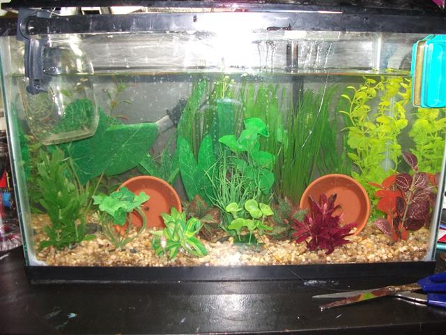 Attached a pic of the tank; It's gravel substrate, combination of silk and plastic plants, CFL lighting, couple terracotta pots.