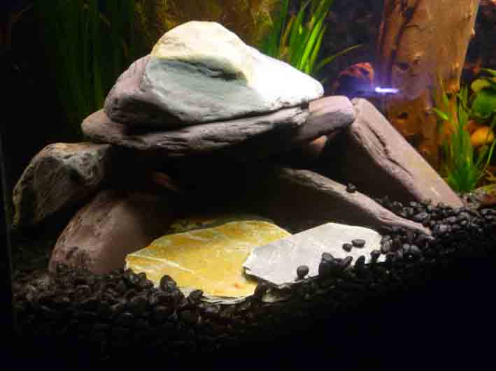 I have used 2 different sized black gravel/ 3d background. couple of different plants lots of lovely slate and stones plus a new 305 filter i got for my birthday
