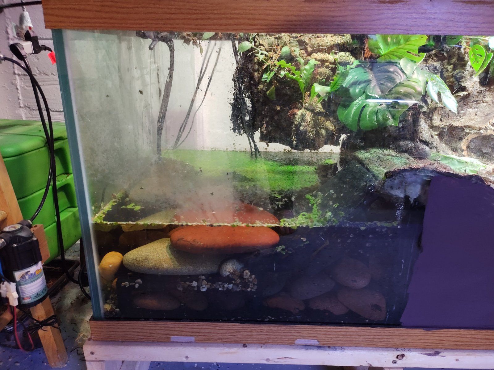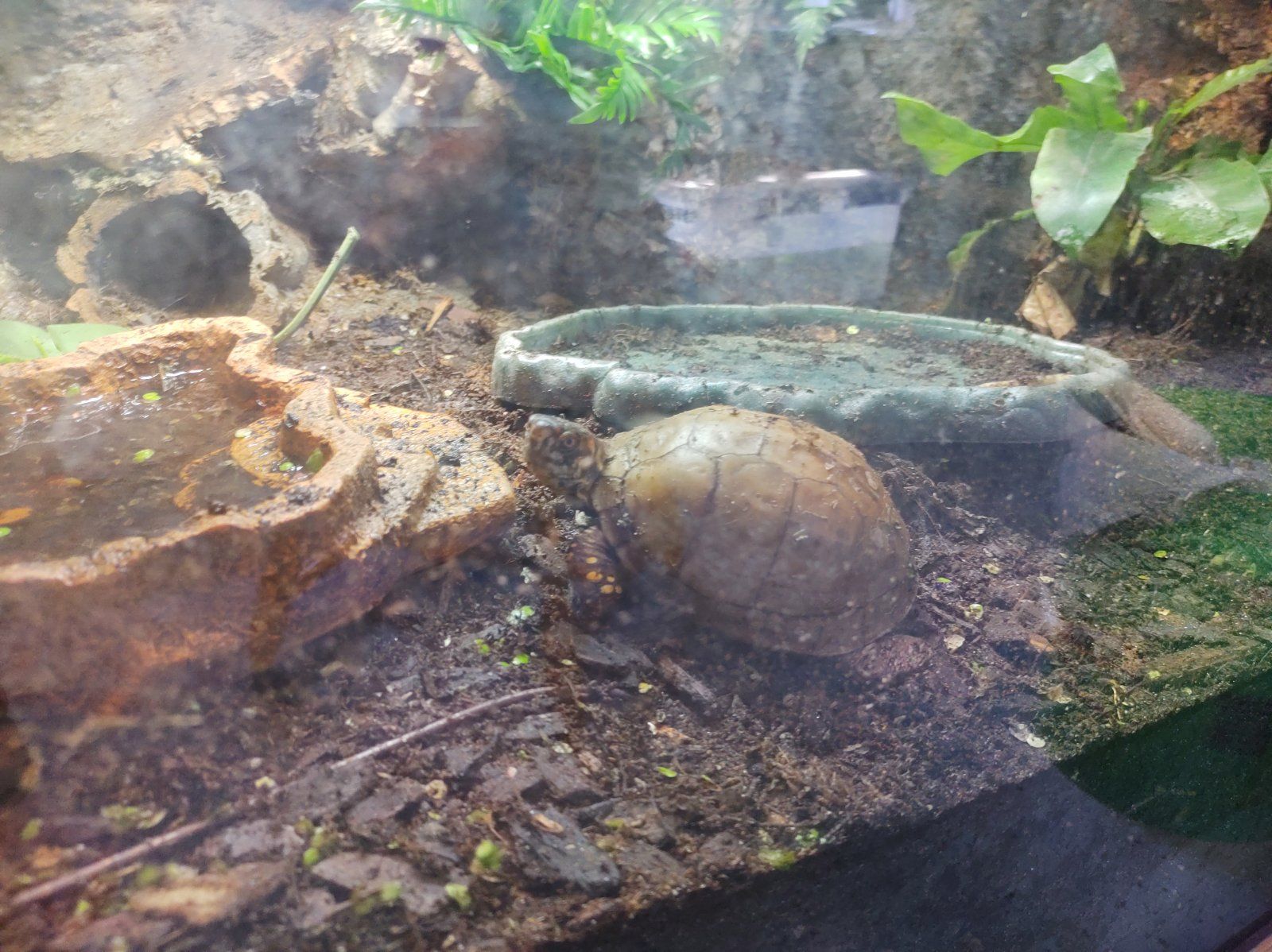 Anyway I got a brief video of before and after, I also added some spider plants as they can be safely browsed upon and will help with any (fingers crossed no) future moisture issues. Had to put the plants in terra cotta pots as Hippie loves to dig up/stomp on/sit on/destroy any planted greenery.