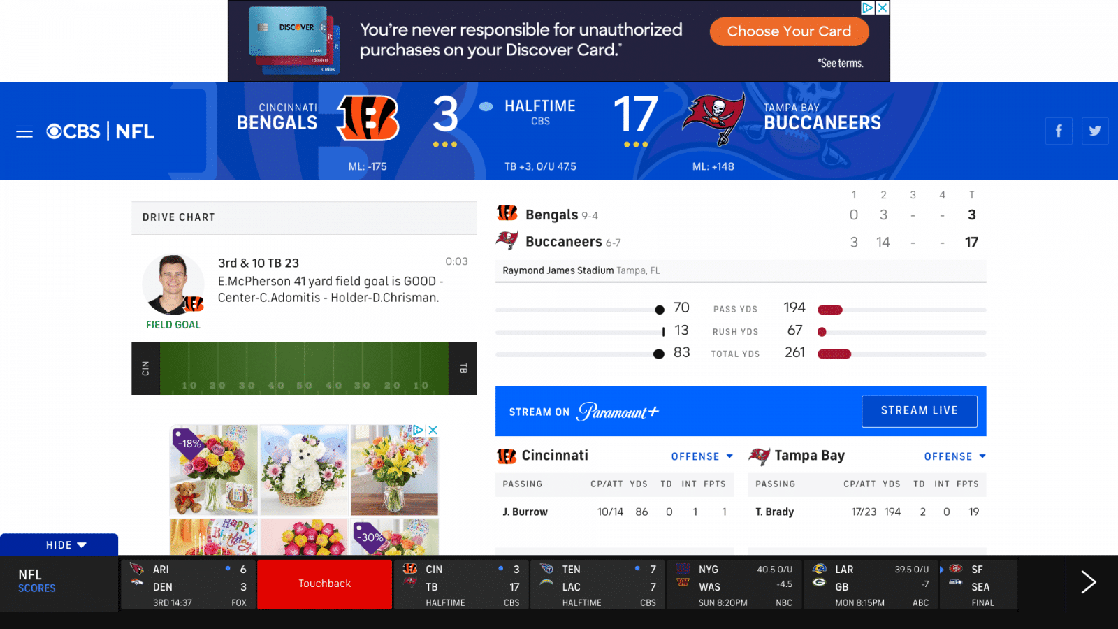 Yep, I'm watching but sort of going back and forth to the Denver game.Well if you are watching the Bucs-Bengals game right now...Brady is looking in his old winning form...offensive line is looking great today as well as the defense too.
