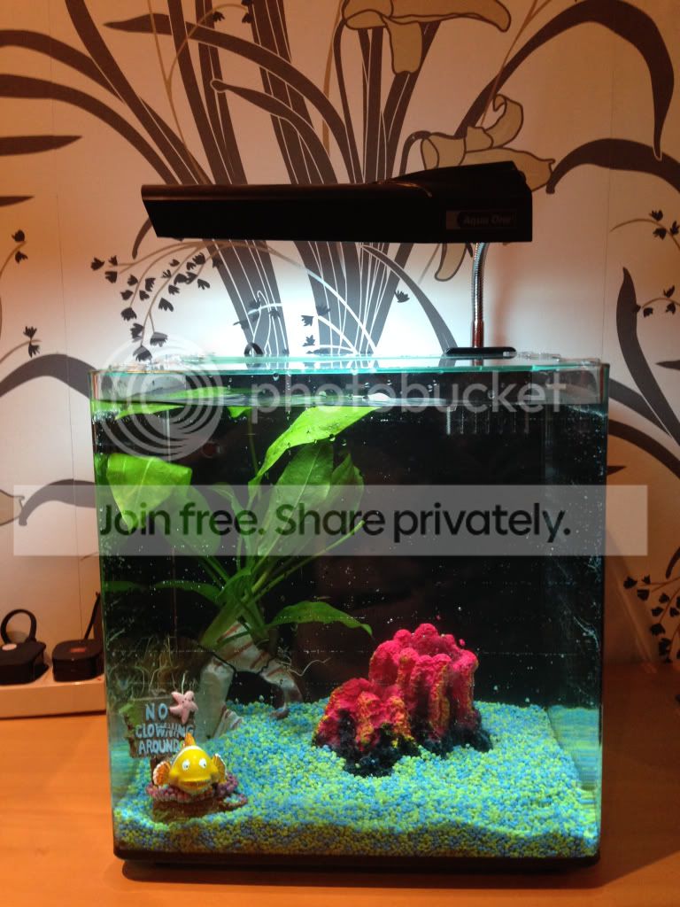 So as stated above its a Aqua One Aquanano 30 (22l). All the equipment is the standard kit what it came with. We bought a new aquarium start up kit by interpret, this was recommended to us. It has 2 products in it called fresh start and filter start, it also has 2 test kits in it for ph and nitrite. We've ordered a api master test kit, but can get it tested for free in the mean time while we wait for delivery. The plant in it is Amazon sword. The fish that will be going in is a male betta. All comments are welcome, positive and negative as we want to get this right. Also we was told that we could fit another species in with that tank so could you give me some recommendations please? The second fish will be for the step daughter, who has already said she wants neons but I've read they fin nip? I was thinking maybe corydoras (providing my water is suitable), but please recommend.