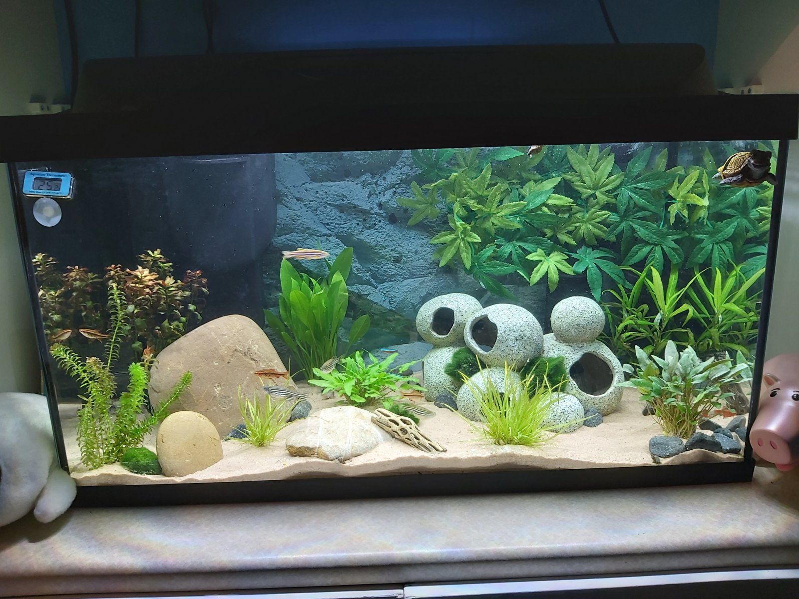 Working with smaller tanks poses some restraints, and frankly makes centerpiece fish almost impossible. In a 29g at 30 inches (75 cm) length, no fish over three inches (7-8 cm) is suitable (with a very few exceptions). A pair of dwarf cichlids with suitable dither fish is an option, or a pair/trio of a peaceful gourami with suitable dither fish would work.