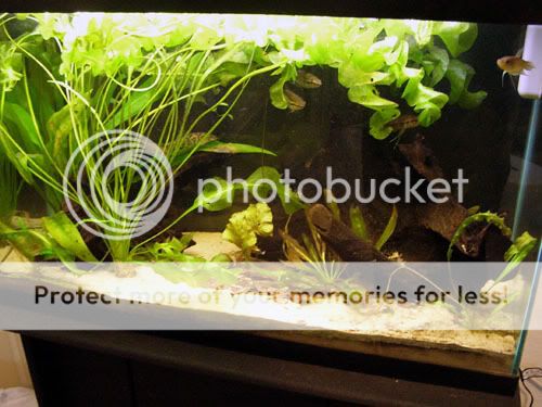 1 senegal bichir (stunted, probably from the horrible infection it got when it injured its eye by running into a rock long ago. Healthy though, apart from the blind eye, and no risk to tankmates)