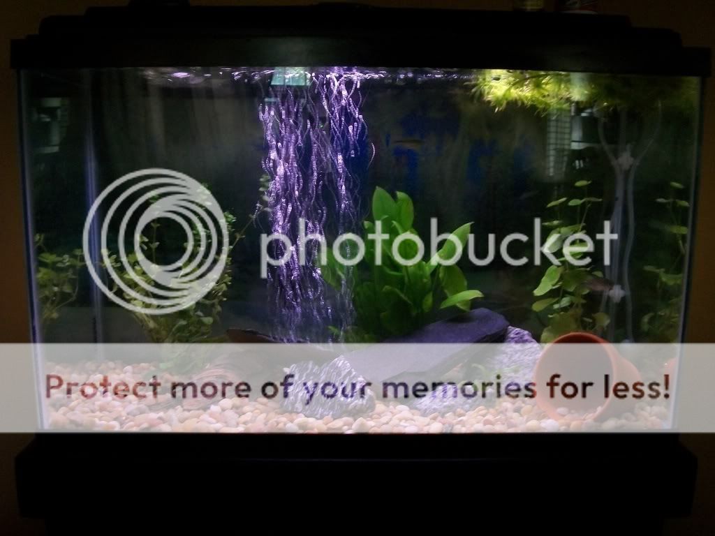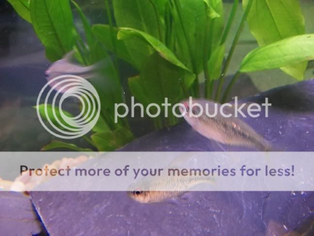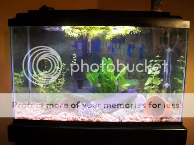 Set this tank up last month and started stocking it this week. It currently has 3x Diamond Tetras and 1 Zebra Nerite Snail. The snail was in the 10g, but the Betta didn't like having company. Plants are 2x Lloydelia (creeping jenny), 3x Bleheri (Amazon Sword), 1x Moneywart, 1x Anubias Nana, 1x Cryptocorne Lutea, and Anacharis floating at the top.