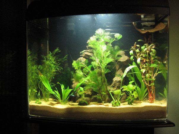 THe first picture is the old setup , but after 3 months or so, the tall plants on the left, middle AND right died...so it was kinda "eh" ish. But he swam around alot. Unfortunately, getting prepped to move, I didnt vacuum or do a water change in about 2-3 weeks...thats what must have caused the fin rot. My camera doesn't get pictures good of him, but I will try when hes out in the open tonight.