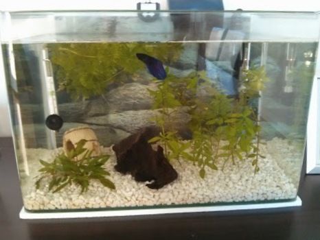 I have a 32 Litre (8.3 gallon) glass tank, heated, filtered, planted and currently home to one male betta. My plants are ambulia, hygrophila, bacopa and cryptocoryne in a small smooth gravel substrate.