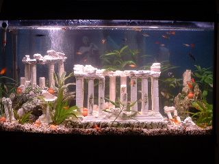 Here is my 46 gallon, bow front tank designed like the lost empire of Atlantis! I've never revealed a picture of it . . . until now! The tank has live plants, something which I really wanted for a long time and I promised myself that my next aquarium would definatly live plants so I finally managed to get them. The tank currently contains guppies, platies mollies and tetras. Enjoy my creation!