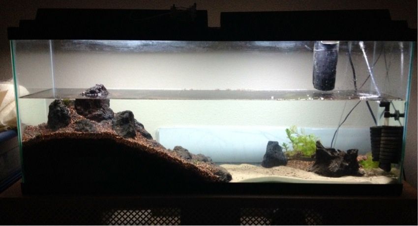 Hardscape: lava rock supported by plastic and slate substrate supports. Malaysian driftwood. CaribSea supernatural sand.