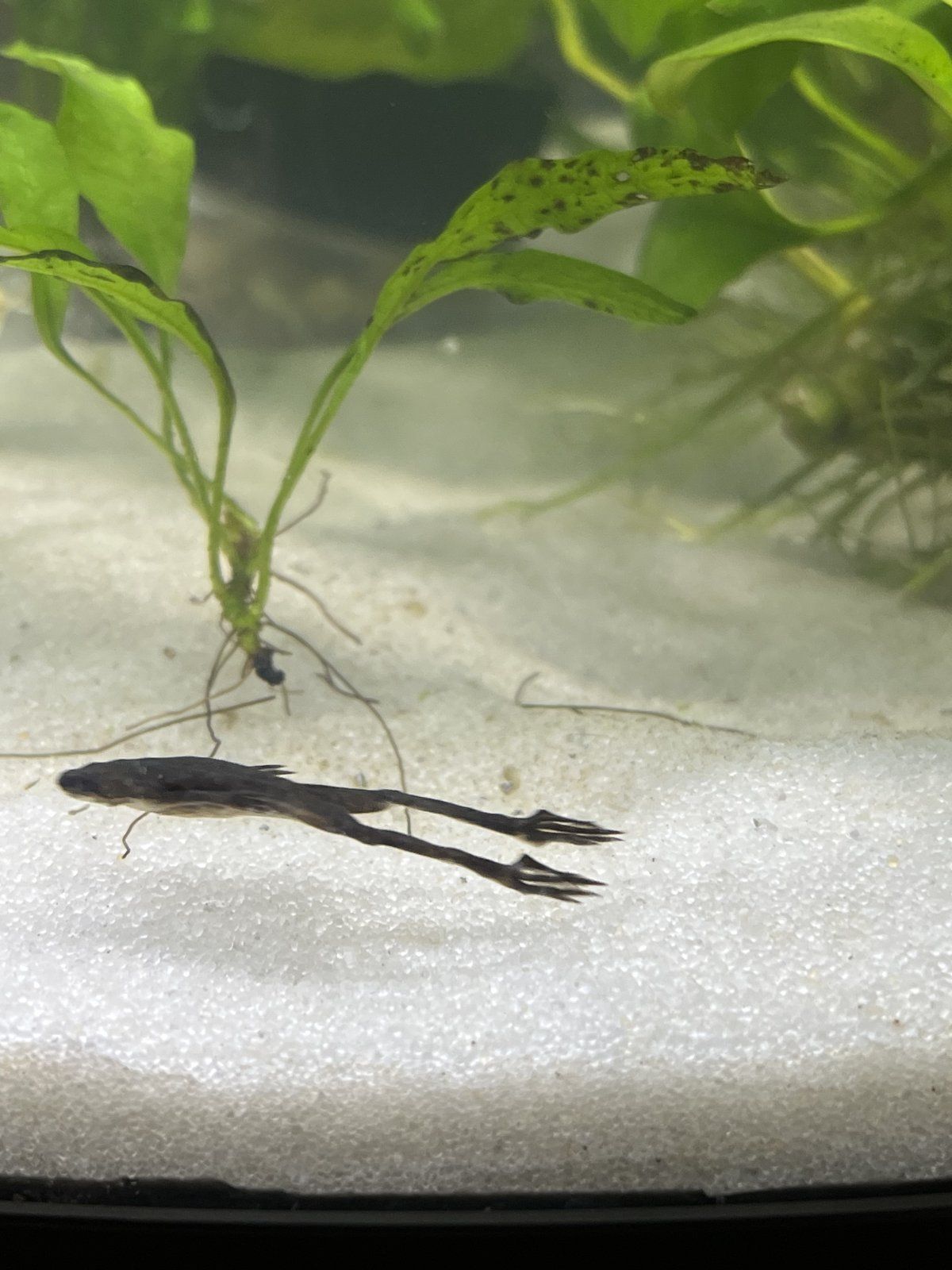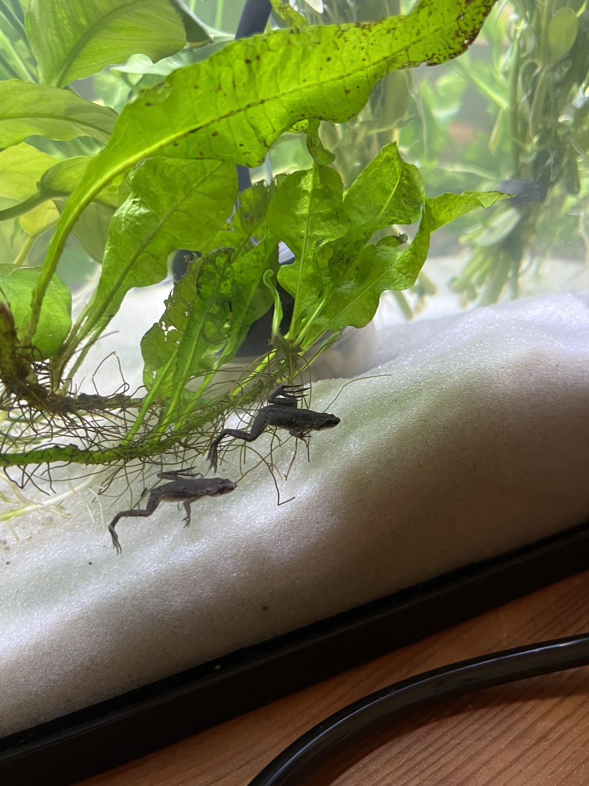 Here's the tank shortly after "rescaping". Really, I just replaced the substrate and removed the cave hide (which would be unsafe for the frogs). Substrate is pool filter sand. I forgot how stark white this stuff is when it's new and shiny. I'm actually looking forward to it getting a little grungy—I think the bright white doesn't look all that great under this lighting. I think if I decide I hate it, I'll switch to bare bottom or small-medium river stones. We'll see. I also want some wood and river stones to glue the plants to, since they don't look the greatest just hovering, but I need to actually get the wood and rocks first. I might also pick up some stem plants to fill in the background. In the meantime, I think this will be alright for the frogs and I'll work on finding them some appropriate hides.