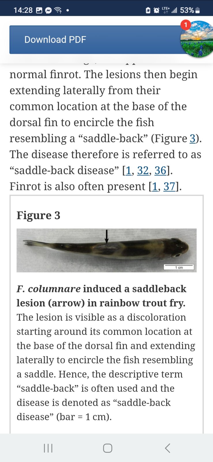 The white on the tip of the dorsal fin of the lacustris rainbow is excess mucous and the damaged area also has excess mucous on it.