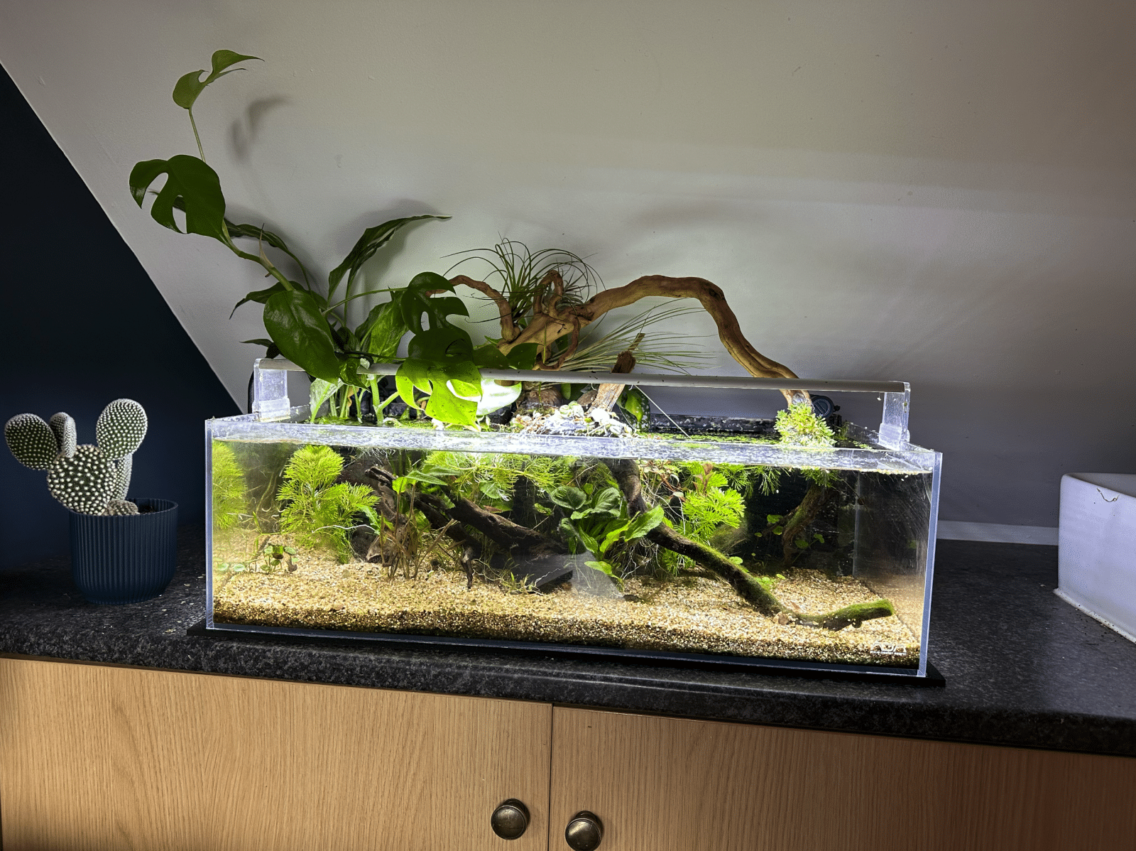 The Monstera looks to be growing nicely here, i do like the look of terrestrial plants above tanks. Monstera and ivy grows well for me but palms and peace lillys nots so well.