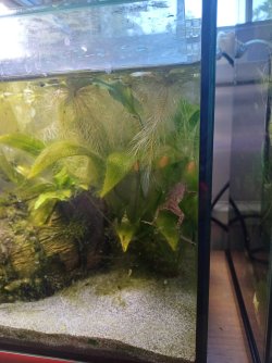 I did wonder if perhaps lack of water circulation might be allowing the algae to thrive, as it's worse on the opposite corner to where the filter is. I didn't use the filter that came with the tank as the outlet is big enough for a frog to get sucked in so I didn’t trust it. The filter is actually rated for a 30g, I swapped it over when I downsized, and added some tubing on the outlet to calm the flow down. Without the tubing the frogs get blown around all over the place as it's so powerful so it's definitely needed.