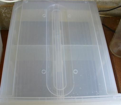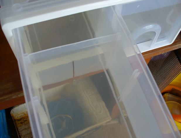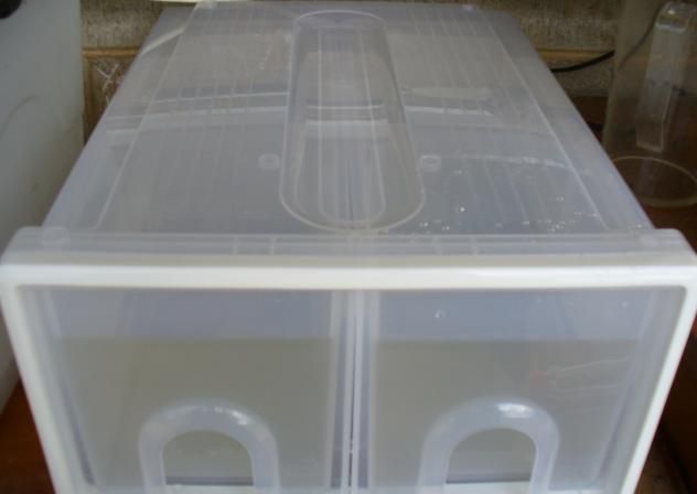 The dividers appear to me to be pretty tough. They have a split in them so there's a bit of give there, but I've whacked them with my fingers pretty hard and I don't think I can bust them. The container's roof stops bettas jumping the dividers. I'll give them a practical test later on - I'll put Valhalla in one side (that's where he's going to live) and Password in the other. Password can't stand to have another betta anywhere near him, he goes ballistic. If he can't knock it down, nothing can, so I'll test it out with him (standing there with a net of course!) Once there is gravel in it that will give the dividers even more stability. I reckon that with a decent light above it you could even grow some lowlight-tolerant plants (java moss, java fern, anubias nana) in it. I like it...