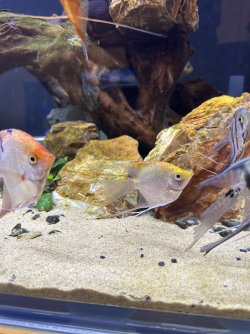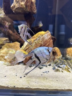 Well, my angelfish, i have 7 of them in my tank, medium age to adults, i have done a 50% water change lately, temp's didn't drop by more than 0.5-1 celesius and then my angels started to act weird, something like a white fungus/slime appeared on 3 of them, and others are just hiding in the tank or resting on the substrate and sometimes goes to the surface, and also some of them try to scratch their bodies on plants, there apetite isn't the best, they usually run to the surface when they me see enter the room, they eat but not that much, i have read online and they say this is Ich or White spot disease, so i have set my tank temp at 28c to 30c and added rock salt to the whole community tank afer a 20% water change and also added Seachem Stability and Prime, there behavior did change a bit after one day, my question here is how shall i handle this case? Do i need a huge water change? media change? use a certain medication? i read about the Aquadene 4 for Ich problems, but using it will kill all the plants, and my quarantine tank won't take all of my angels.