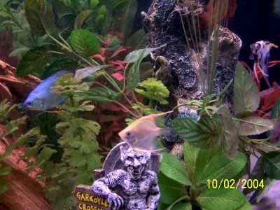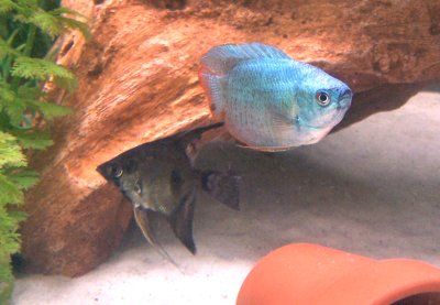 I was a bit worried about keeping 2 male gouramies AND keeping gouramies with angels, but everything is going really well. When I first put the angels in, the blue gourami kept touching the angels with his feelers (pelvic fins, I know