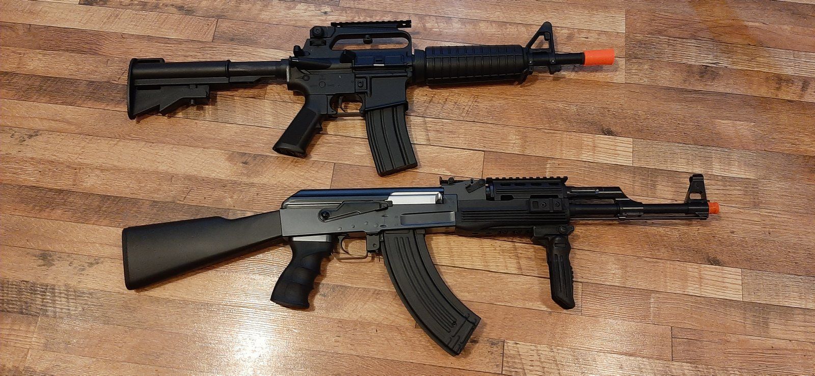That said, I got a new toy as well! A Lancer Tactical IU-AK47M (Lancer Tactical branded CYMA CM028). I put red dots on both my wife's M4 and my AK. I'll have to downgrade springs in both to play at our local fields. Both shoot quite hot.
