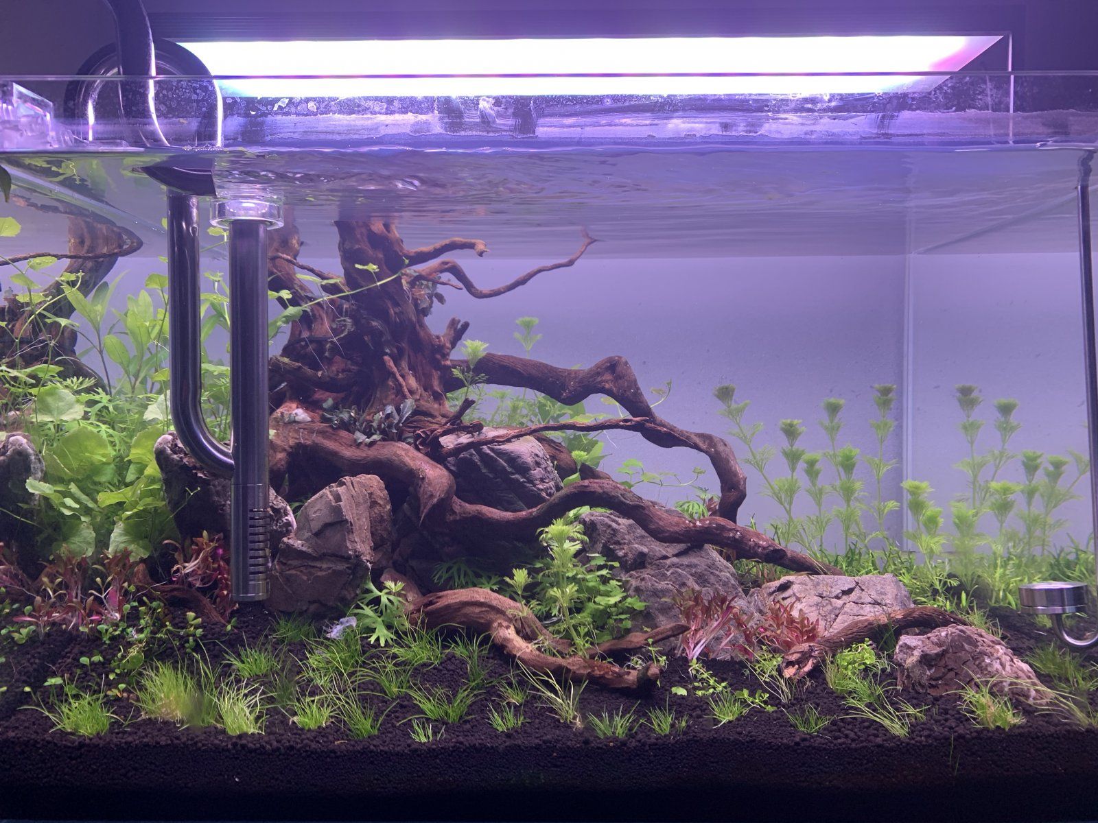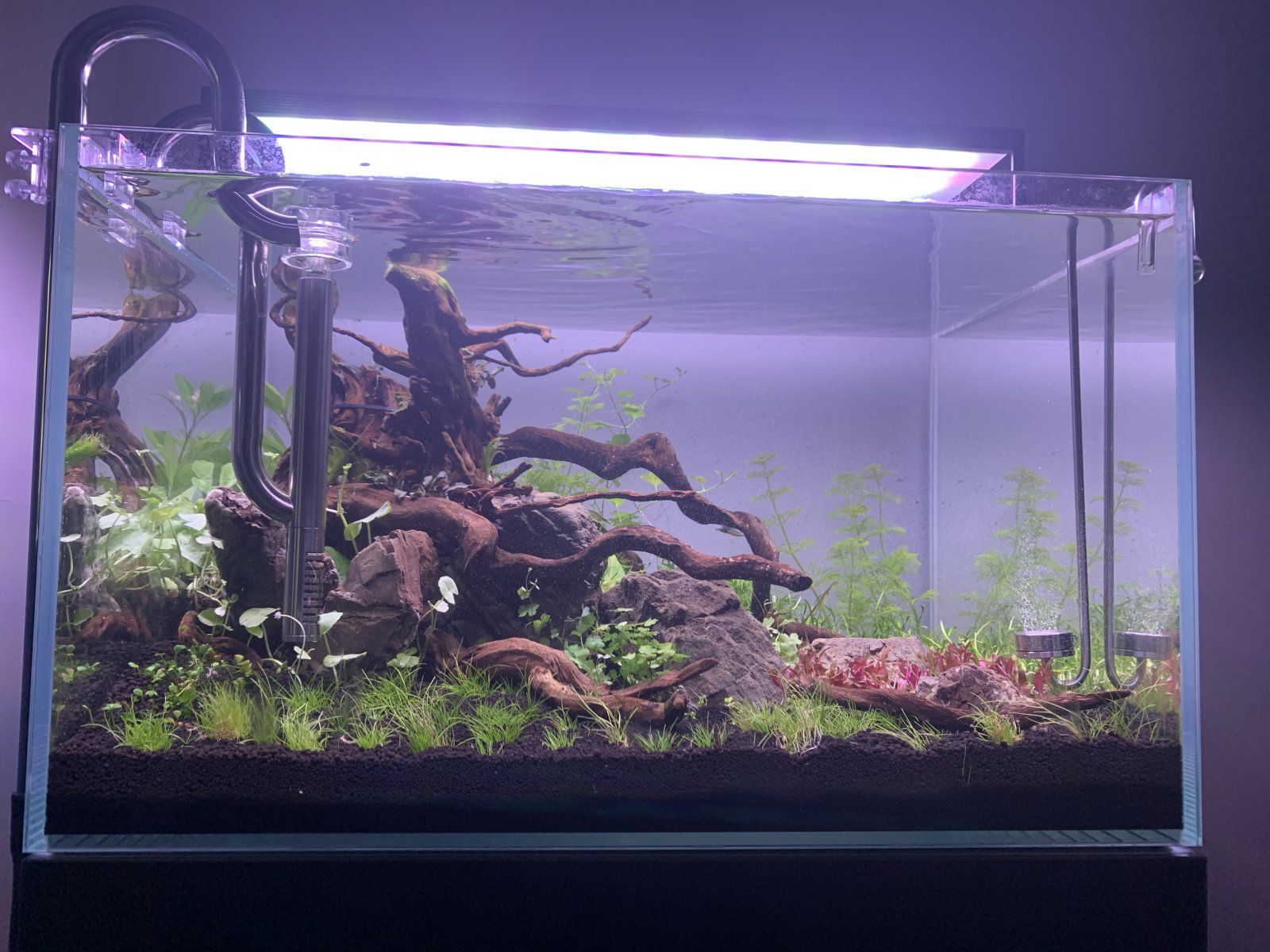Interestingly after planning the other scape quite specifically I think I prefer the organic nature of this tank and from looking at the pictures and the tank itself I can see what I want to do with it over time. When the new plants arrive tomorrow I am going to move some plants around, the cardamine on the left is going behind the wood in the middle and the new Hydrocotyle Tripartita is going to go into the hole at the front middle under the branch. The annoying thing is that the rock there is the nicest one with great texture but you can hardly see it... I've got some of the hair grass behind the rocks on the right so going to move it to the front to flesh out that area with more plugs and plant my last pot of Helenthiam at the back to replace it.