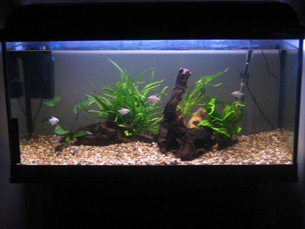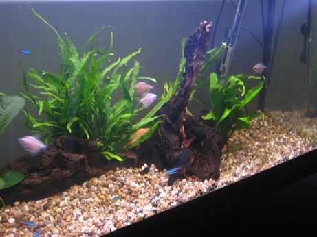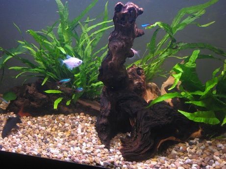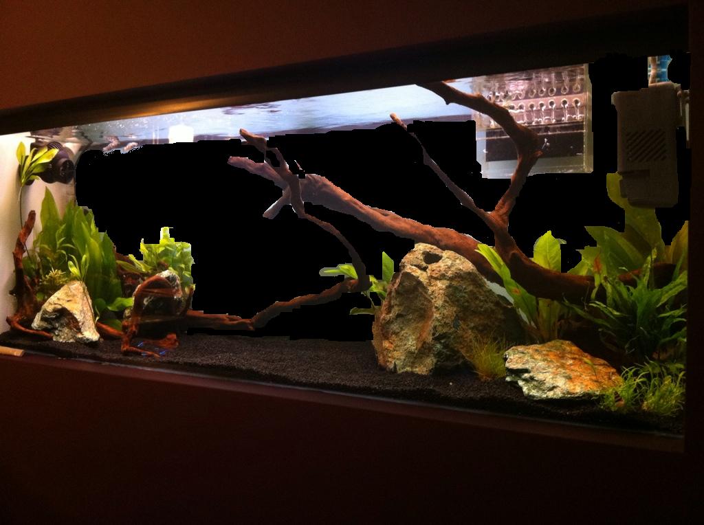 So heres my 1st attempt at some aquascaping its very much a work in progress i got 2 pieces of mopani wood and created a root like focal point. I have added a java fern to grown on this and will probably add moss to the main branch