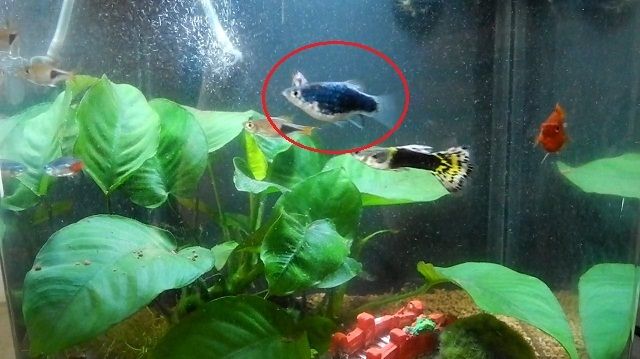 I have a mini tank with 4 neon tetras, 4 rasboras, 2 blue platies, 1 red balloon platy, 1 guppy and 1 pleco. Yesterday I spotted a baby fish hiding between the plant's leaf! I have no idea whose baby it is (photo attached), anyone can tell? Had a healthy orange molly suddenly died 3 days ago, not sure if she's (I supposed was a she) died from labor?