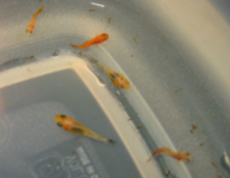 they started to get colour about 1 week ago. their mother is like the two bigger ones and the father is an orange swordtail so i hope to get some swordtails.