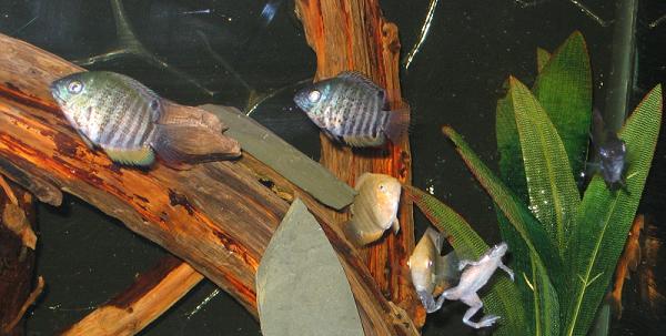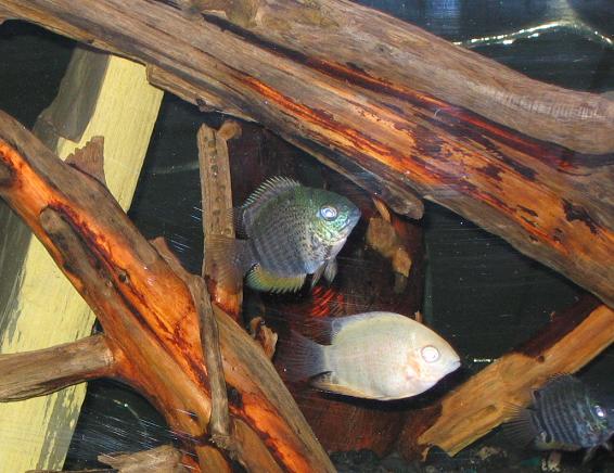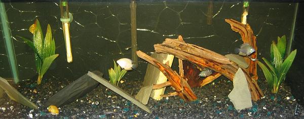 dwarfs - Yep, I've got 3 ADF in there. Everyone seems to get along great. All in all I have 3 ADF, 5 Baby Severum (2 Gold, 3 Green), 2 Apple Snails, 2 Ghost Shrimp (they've been in there for about a month, but I'm guessing that some day they'll become cichlid food), a few guppies (also may become food. they were originally in the tank to cycle it but they looked nice so I kept 'em in there), 1 chocolate plec, and 1 clown plec. They're all in a 30 G and I've got another 30 G right next to it that I'll be expanding them into. I assume that within a year I'm going to need to get a much larger tank to house them all. I'm thinking about connecting the two tanks to create, in effect, one 60 G for them to live in.
