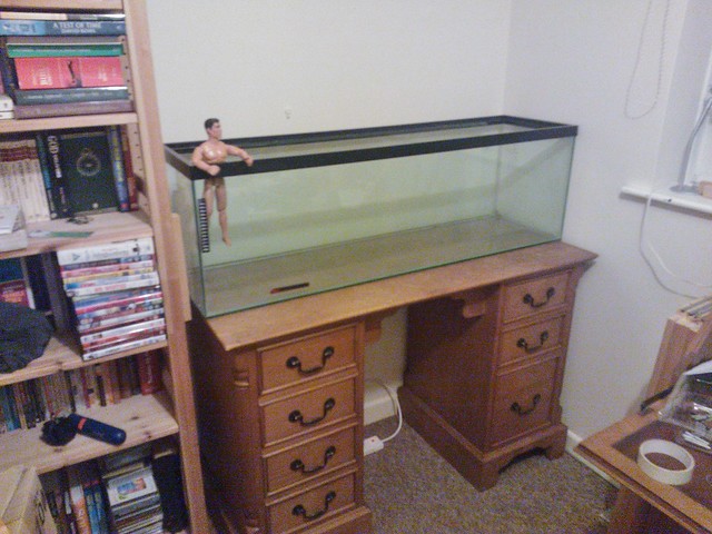 Here's the new tank in place. Very sturdy drawer unit donated by wife, ideal for storing kit in, and space for the external pump in between. This is my personal office in our house.