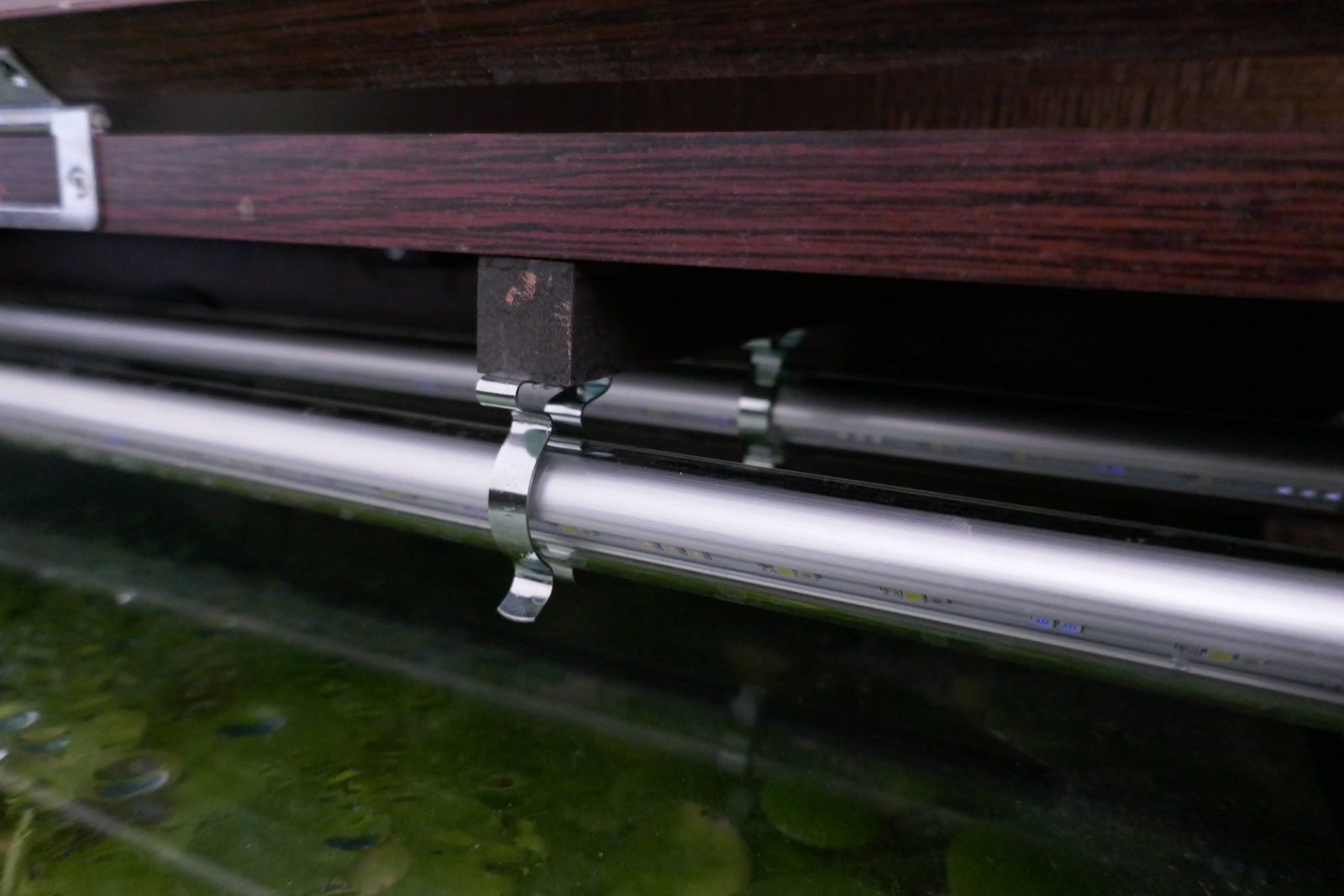 They put two strips running front to back under the fixed part of the lid. They did use plastic T8 clips but these tubes are between T8 and T5 so I replaced the plastic clips with metal ones which are more flexible than plastic and can fit any size tube.
