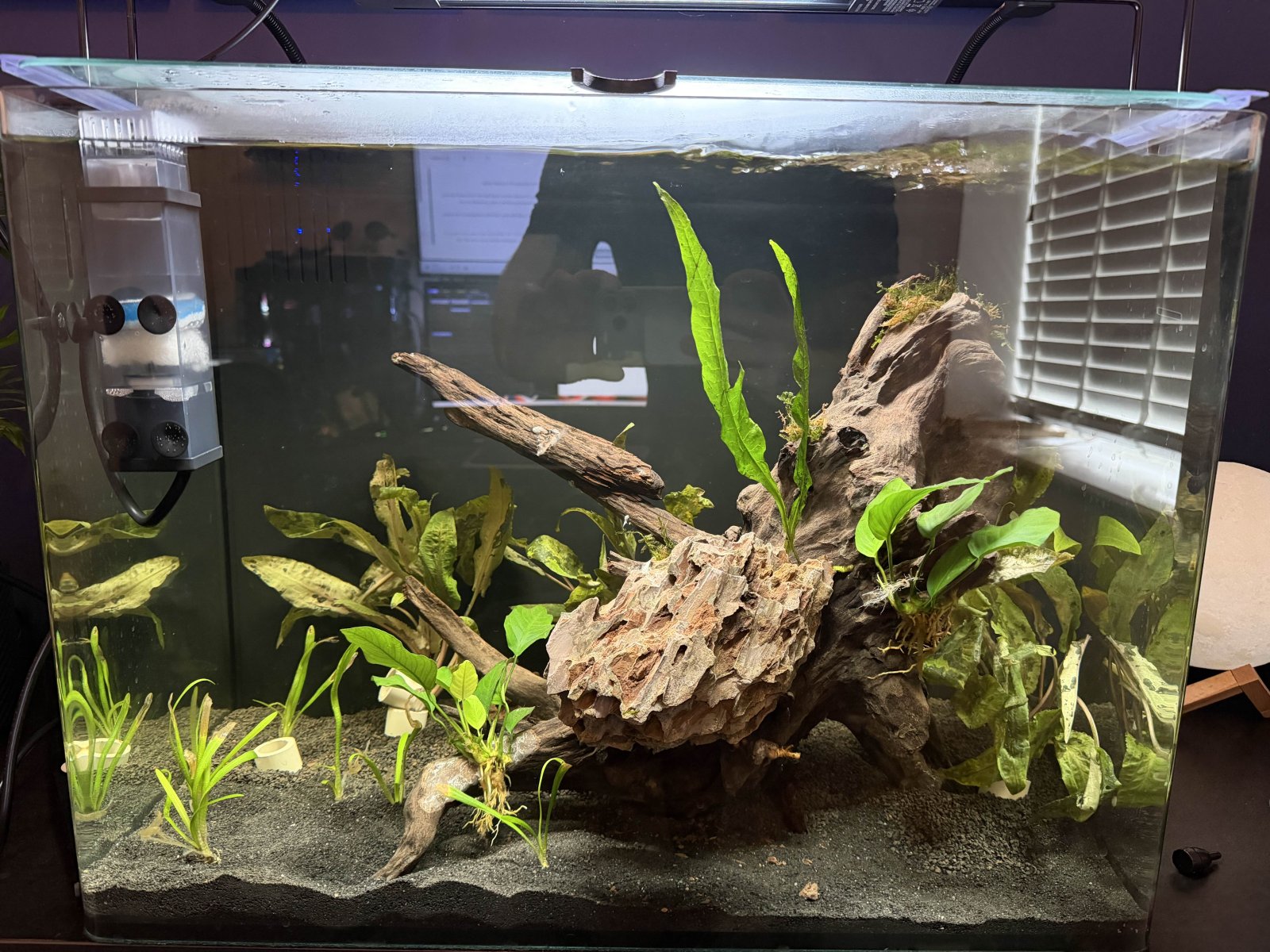 I’ve picked up an AquaOne AquaNano 60, running it around the 100 litre mark, and I’m going down the lightly planted route this time. Currently somewhere in the messy middle of a fishless cycle. Temporarily got surface skimming filter just because of the plant melt and film from the wood settling.