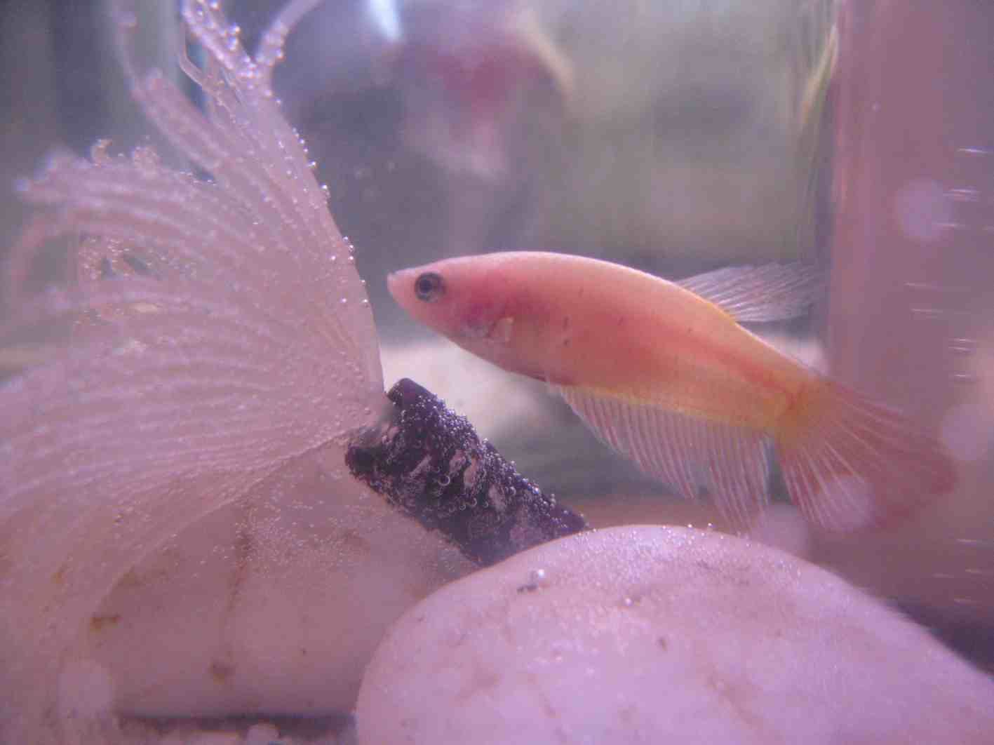 I had a sad incident with my female betta Gem this morning, she flipped out the tank and cut herself to be honest I didnt think she would make it, but she's still going and seems to be improving, she was to be bred with my MG boy but if she recovers she will now be strictly as a pet not for breeding just to be safe. I went to my LFS to get her some medication and came home with two new girls. Unbelievably there was a gold plat female the spit of a young Gem in one of the tanks the only difference is a pink wash to her tail and I also took a pink/purple girl who was a bit beaten up in the corner of one of the tanks. Neither have names yet if anyone wants to add ideas for names that would be cool, preferably something to do with their colour etc?!?