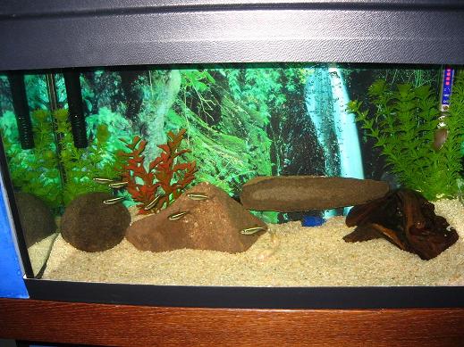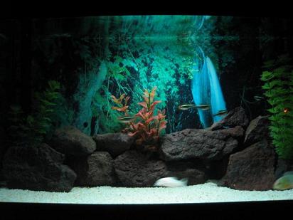 I like the change, it looks much better. I would also recommend a black background, very elegant. Your fish would stand out more, especially with the darker rocks.