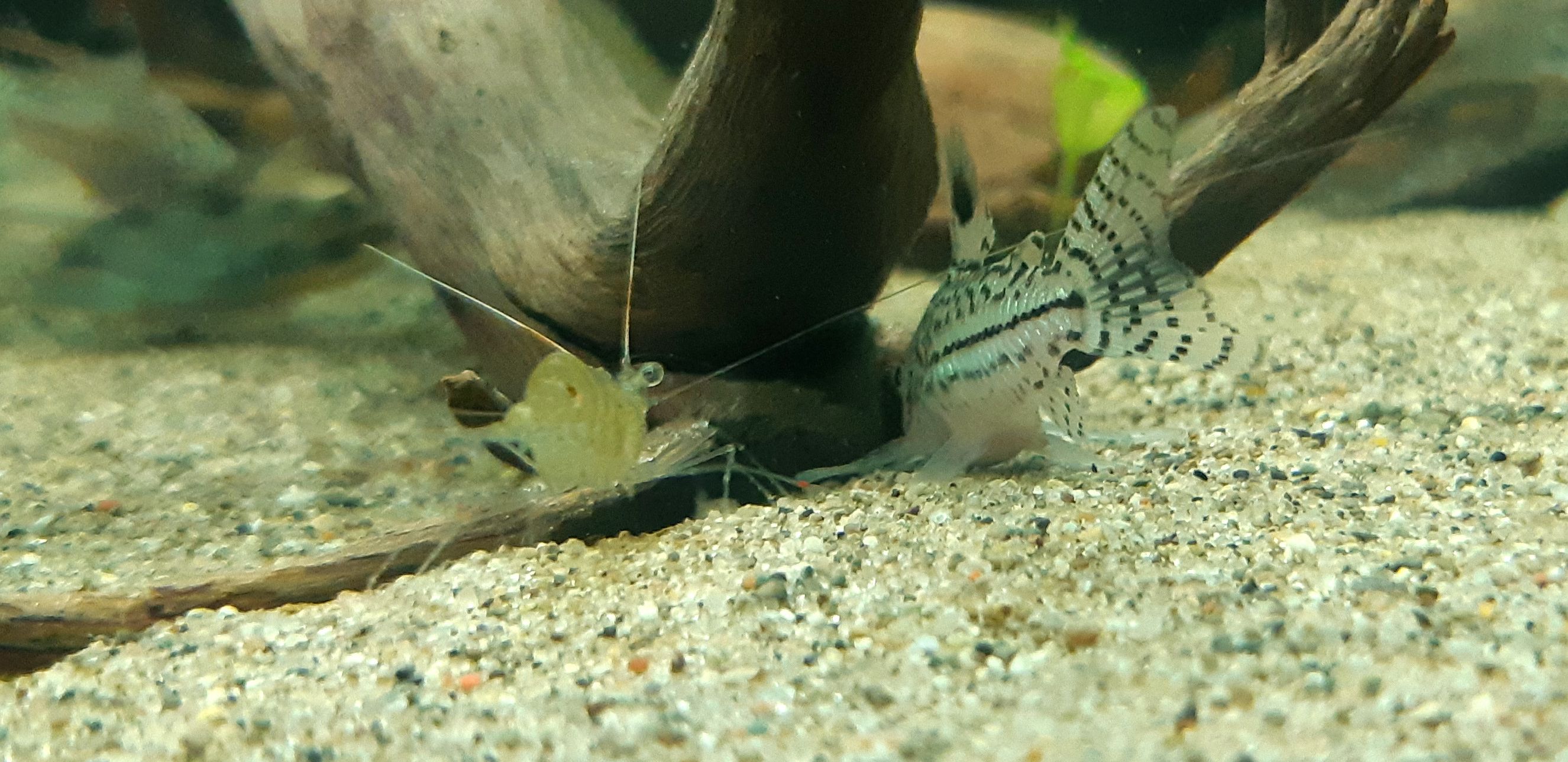 I keep mine with ghost shrimp, small males before when i had those, and females. They forage alongside each other. Adult cherry shrimp would be alright too.