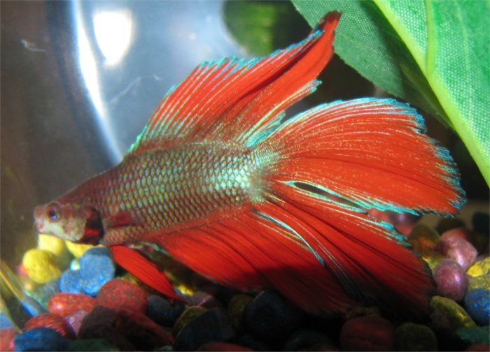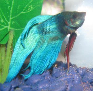 So cute. Around a month or so, I had brought home a blue VT who seemed a bit under the weather. Since then, he was so-so then became more ill. . .I nursed him back. He's in a smaller home, but has a heater and regular water changes. The deal is I had moved him into my bathroom so I could do the water changes more easily (and have decided to keep him in there). He's on the counter and I had slipped paper between the glass and the mirror so he couldn't see himself even thought he has NEVER EVER flared. . .