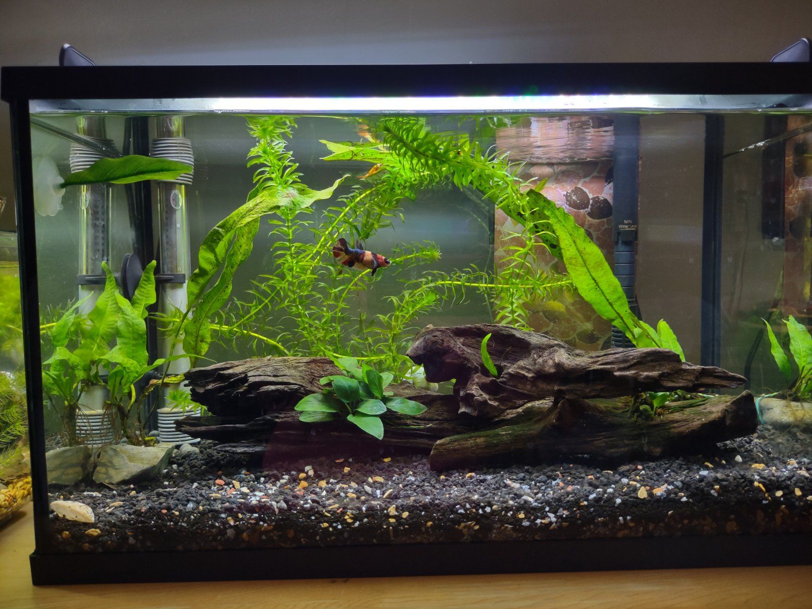 Before patty was in it I had 5 neons with Casper. I decided to not have tank mates (except snails) with my bettas and got the 20 so I could have a school of small happy fish, I got more neons and combined them in the 20.