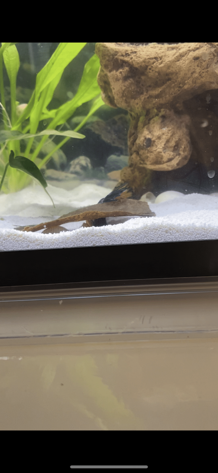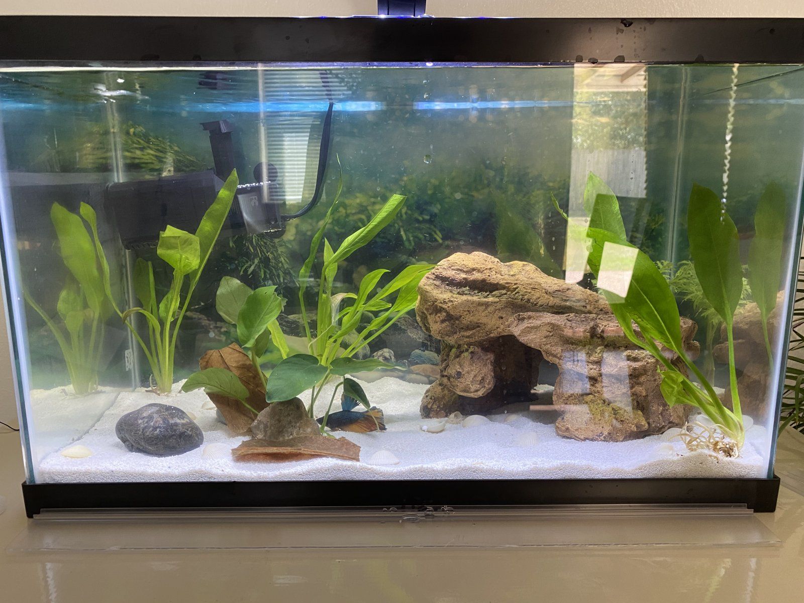 Well that's no good come on a proper picI added almond leaves to my new bettas tank and he has managed to hide underneath of it lol.