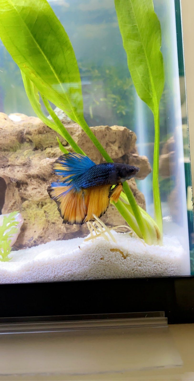 Beautiful blue similar to my leo's colourHaha here’s better fish and tank pics. I have a big order of plants coming in to fill this baby up. But this is Saturn! Every pic on here he is laying at the bottom but he actually swims around a lot haha