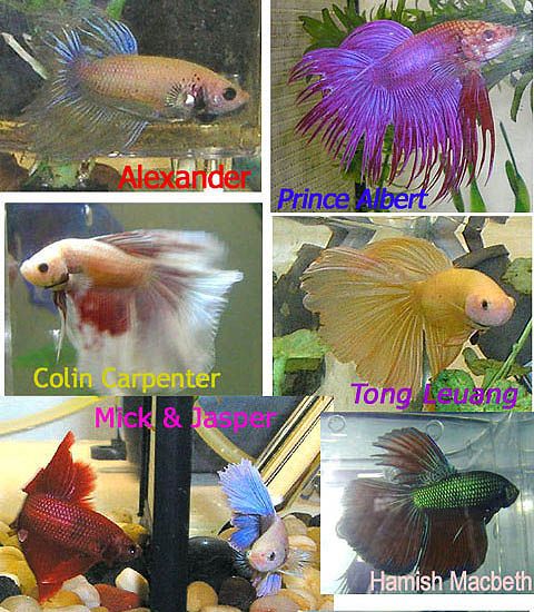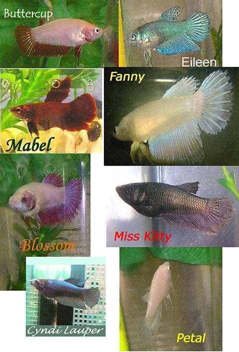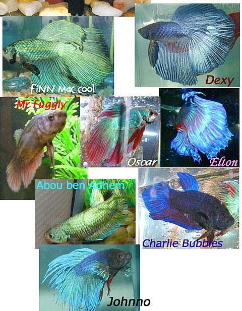 Here is my fish: My "Kai" Male He's a VT I have no idea of the color He's about medium size No idea of age My "Ula" Male Metallic Plakat Young Small My "Orlena" Female Red CT Young Small (Sorry, the pic is before she really started to develop the CT) Unnamed (donated by my friend) Female VT(turquoise) No idea on age Medium to Large Unnamed (rescue girl--maybe ''Venus'') Female VT? (He fins were all ripped off when I got her) Very young Small