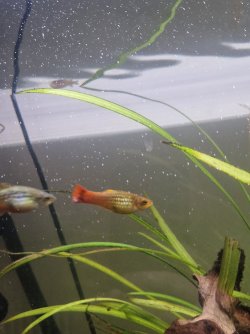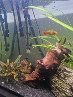 Anyhow, I'd just left the plants floating in the QT after I bought then July 28th. But then moved the tank and set it up more like a proper tank, planting the plants and deeper substrate. Used Argos play sand - it's aquarium safe, super cheap, so don't mind if I have to chuck it from a QT tank if a disease or problem did crop up. I already had the wood and stone hardscape, and the plants are trimmings and new plants grown by other hobbyists and sold super cheap. I got three of them, the vallis, guppy grass and another for £2!