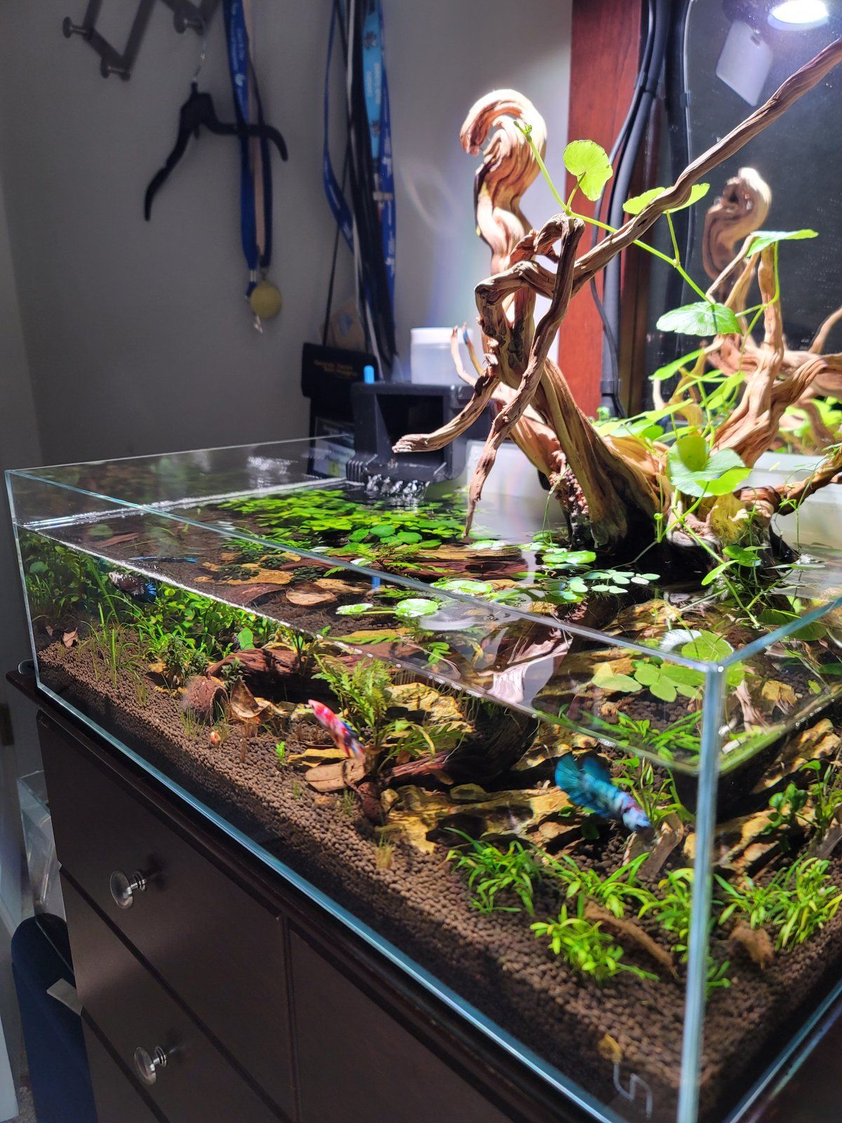 So, I have to start with the fact that I love your setup. As much as I love a good betta, I usually don't have room to keep any more than two in the household. How is the stocking going, aggression and space-wise? You have a LOT of plants, and with the tank being a shallow 10 gal there's a lot larger footprint.My 10g shallow sorority setup. 5 Female galaxy hmpk, 20 ember tetras, 3 Otos.