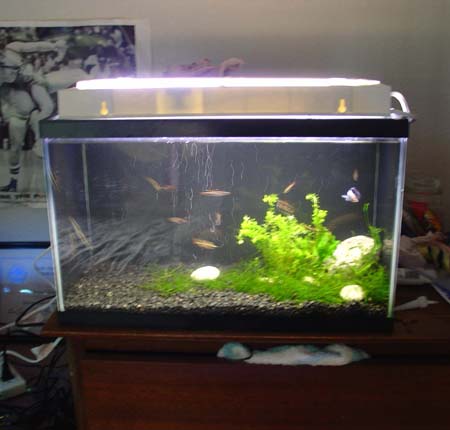 I have 2 15W flourescent lamps for the 10g. I wanted a third, but I can't fit it. I'm guessing it will be ok, since I'm not planning to use species with huge light demands. One of the two fixtures is going to have an 18000k aqua glow, and the other will hold a 25000k lamp froum wal-mart.