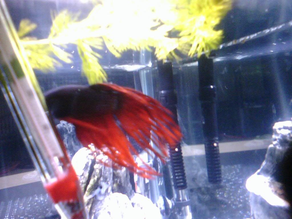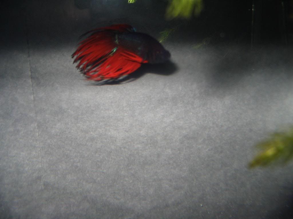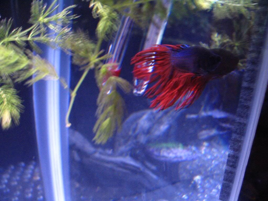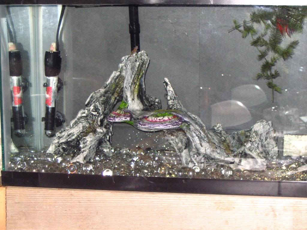 Ok, so i was given a 10g tank that was in dire need of a cleaning after my buddy adopted the lonely black tetra in it. I've set it back up on a small 2x4 frame and threw some christmas lights underneath the tank and added a single layer of glass beads and marbles to reflect the light, and dropped in a nice CT Betta. Anyone have any suggestions on anything else to add to the tank for decor or tank mate?